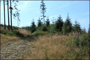 Po návratu k odbočce pod Siebensteinkopf pokračujete dál po hranici po značce se symbolem sovy. Na horizontu se rýsuje hřeben od Malé Mokrůvky až po vrchol Luzného, blíže před nimi masiv Steinfleckbergu a úplně nejblíže rozložitý dvojvrchol Farrenberg. Po necelých 100 m se značená trasa od hranice odklání a vede k malebné vodní nádrži Reschbachklause
