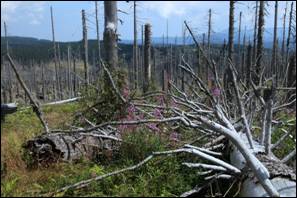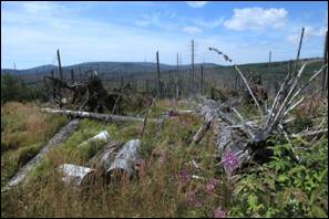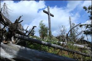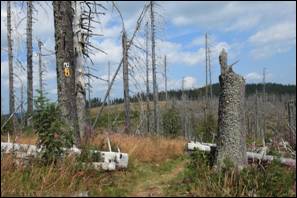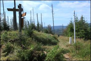Doporučuji třetí možnost – vystoupit na vrchol a k této odbočce se vrátit. Výstup za suchého počasí není obtížný, i když varovná cedulka oznamuje náročnost a pevnou obuv. Za mokra je třeba dát pozor – cesta přes kameny a kořeny bude kluzká. Po necelém půl kilometru poměrně příkrého stoupání omlazujícím se lesem a výhledy skrze pahýly uschlých smrků dorazíte k dřevěnému vrcholovému kříži. Výhled z výšky 1263 m i tady částečně zakrývají uschlé stromy.
