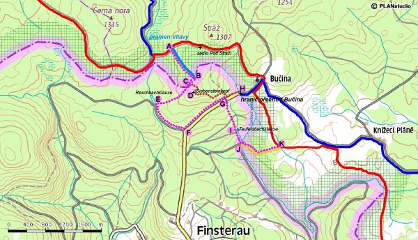 A – odbočka z červené z Bučiny nebo od Pramenů Vltavy na modrou značku k hraničnímu přechodu