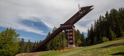 Rozhledna na vrcholu bývalého skokanského můstku, horolezecká stěna, k rozhledně vede lanová dráha.