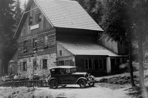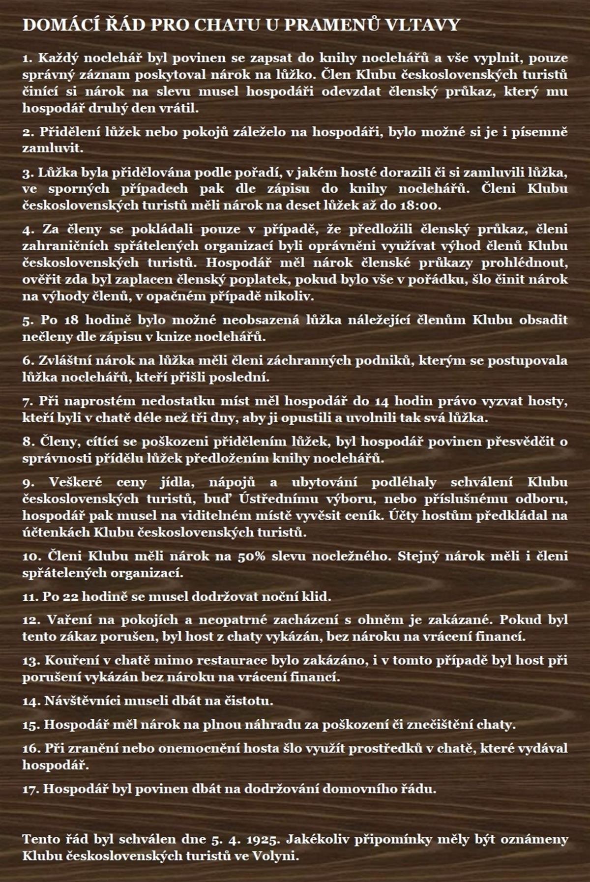 Od Pramenů Vltavy se před 100 lety rozbíhaly takřka všechny barvy značených cest – červená na Bučinu a do Luzenského údolí, žlutá na Modravu a modrá vedla do Kvildy. Turistický průvodce z roku 1923 ke stavbě chaty uvádí: „nedaleko pramenu jest roku 1922 postavena nákladem velkostatku Zdíkov a Klubu československých turistů chata s občerstvením a noclehy.“ Zmiňme si některé pasáže z povolení pro stavbu chaty a povolení k provozu hostinské a výčepnické živnosti. Ke stavebnímu povolení bylo připojeno několik podmínek: „ve všech místnostech se postaví zdravotní plivátka a umístí nápisy zakazující plivání na zem, obě noclehárny se propojí s nájemcovým elektrickým zvonkem. Vzhledem k materiálu, ze kterého je chata vystavěna, musí být pro případ požáru umístěny nádoby s vodou a kromě toho vždy přiměřený počet hasičských košů na vodu. Toalety musí být zřízeny na severovýchodní straně dvora za domem nájemcovým. WC musí být kryté, uzavřené ze všech stran a odpad sveden do odvodového kanálku. Schodiště ke studentské noclehárně musí být vybaveno zábradlím a pro případ požáru ohnivzdorně zapečetěné. Nocležníci, sobě cizí, musí být vždy děleni podle pohlaví, v místnostech a na schodišti se nesmí kouřit, o tom informující cedulky musí být umístěny v chatě. Také musí být u chaty k dispozici dva žebříky. Ve všech místnostech hostinských a v kuchyni musí být dbáno na čistotu. Budova se musí opatřit hromosvodem. Kniha cizinců musí být pečlivě vedena a vždy na žádost orgánů veřejné bezpečnostní služby předložena. Majitel koncese se musí podrobit veškerým předpisům živnostenského zákona a nařízením příslušných úřadu. Při každé změně nájemce je potřeba zažádat o schválení příslušný úřad.“ Povolení na provoz hostinské a výčepnické živnosti v chatě obsahovalo tato oprávnění: přechovávání cizinců, podávání pokrmů, výčep piva, vína a ovocného vína, podávání lihových nápojů, kávy, čaje, sodové vody a jiného občerstvení.