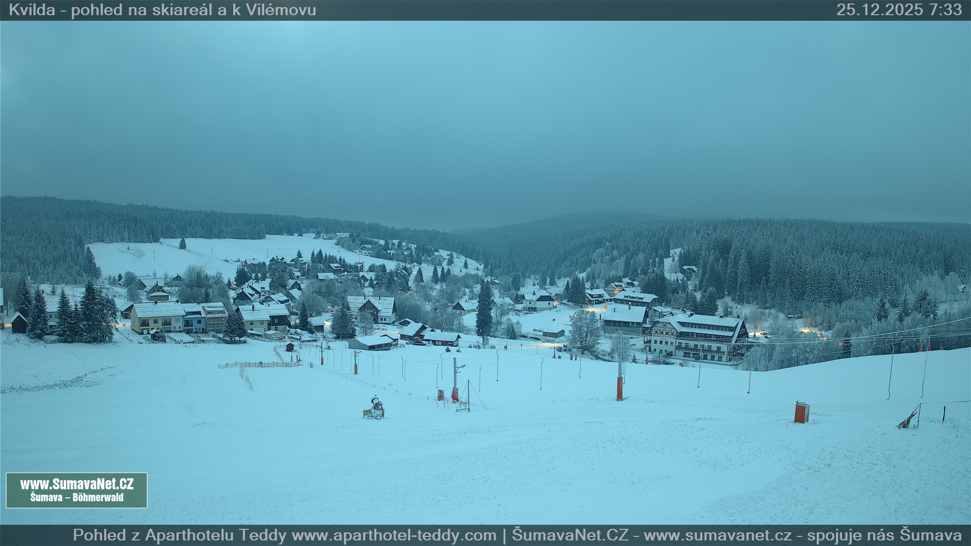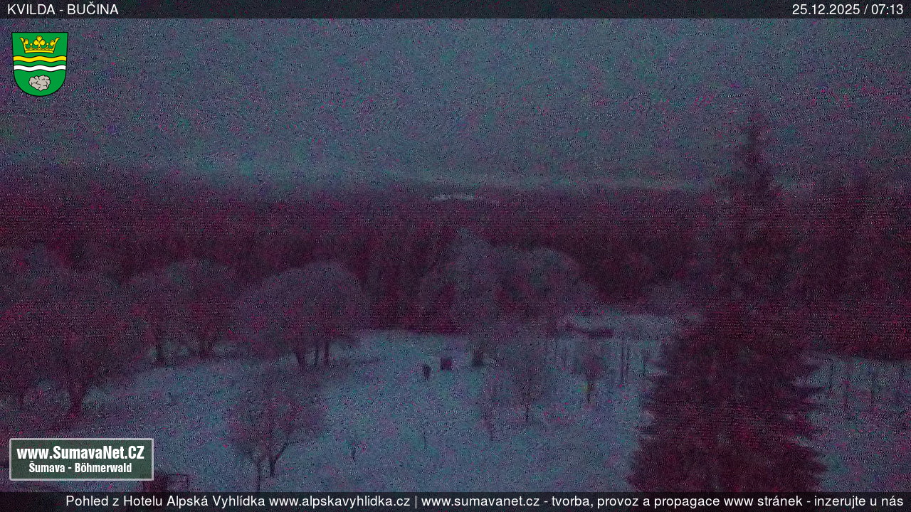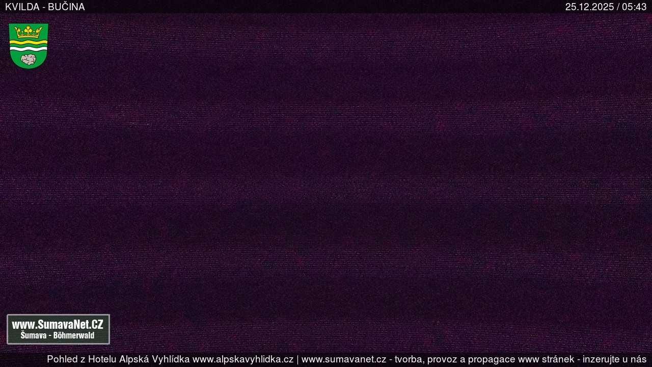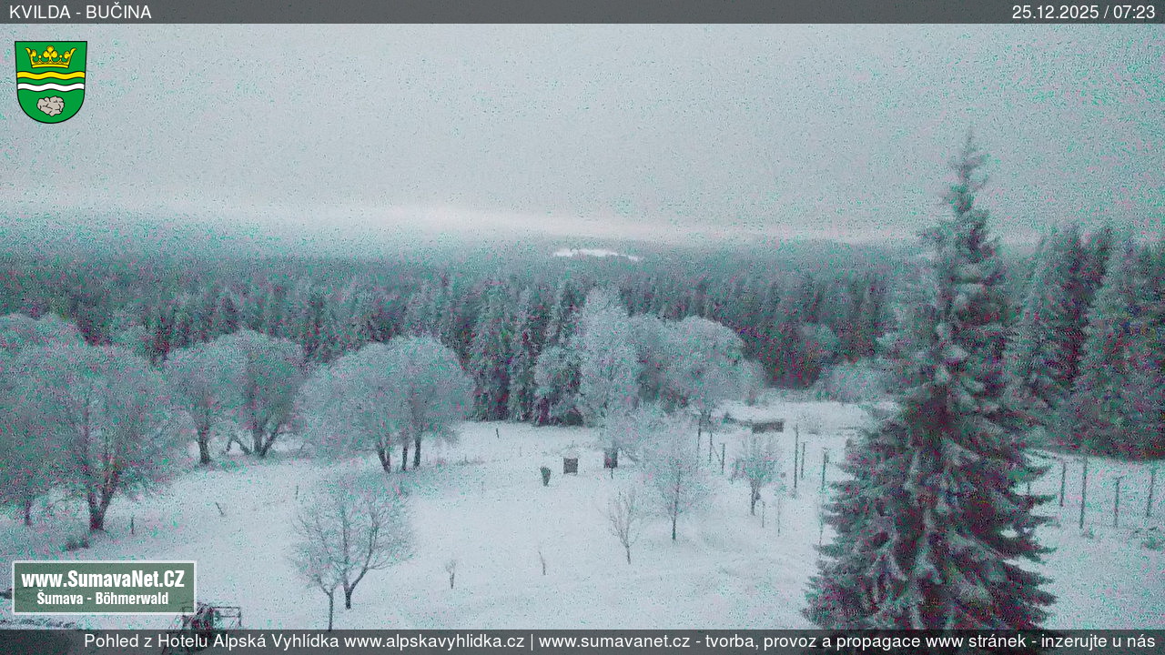 Page contentWebCamsKvildaBig Image25.12.2025 4:04:33Select time: Archive: Today 1 day 2 days Week Month 100 days Year Provozováno Informačním serverem ŠumavaNet.CZ ŠumavaNet.CZ & Aparthotelem TeddyKvilda - Jezerní potokBig Image25.12.2025 3:57:50Select time: Archive: Today 1 day 2 days Week Month 100 days Year Kvilda - centrum25.12.2025 4:04:42BučinaBig Image25.12.2025 3:56:07Select time: Archive: Today 1 day 2 days Week Month 100 days Year Další webkamery Tyto dvě kamery Vám přinášíme ve spolupráci se sumava.eu Refresh page